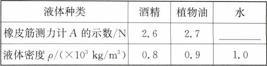 (3)液体的重力$G_{液} = m_{液}g = \rho_{液}gV$,测量液体密度时,橡皮筋测力计的示数$F = G_{桶} + G_{液} = G_{桶} + \rho_{液}gV$,测量酒精时,$G_{桶} + 0.8 × 10^3\ kg/m^3 × 10\ N/kg × V = 2.6\ N$ ①,测量植物油时,$G_{桶} + 0.9 × 10^3\ kg/m^3 × 10\ N/kg × V = 2.7\ N$ ②,联立①②两式,解得$G_{桶} = 1.8\ N$,$V = 1 × 10^{-4}\ m^3$,所以该密度计的零刻度应标记在橡皮筋测力计A刻度板的1.8 N位置.测量水时测力计的示数$F = G_{桶} + G_{水} = 1.8\ N + 1.0 × 10^3\ kg/m^3 × 10\ N/kg × 1 × 10^{-4}\ m^3 = 2.8\ N$,则表中应填的数值为2.8.