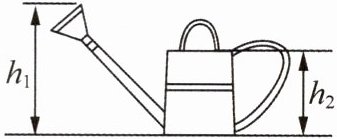7. (2025·北京期中·2分)如图所示,一个平底薄壁洒水壶重$ 5 \, \mathrm{N} $,底面积是$ 80 \, \mathrm{cm}^2 $,放在水平地面上,$ h_{1} = 18 \, \mathrm{cm} $,$ h_{2} = 15 \, \mathrm{cm} $,当洒水壶中装满水后,地面受到的压强比洒水壶底受到水的压强大$ 750 \, \mathrm{Pa} $,洒水壶内的水对壶底的压力为