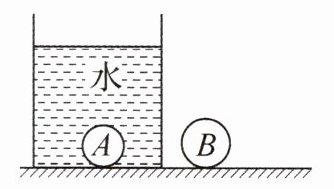上分点三 如图所示,装有水的薄壁轻质柱形容器置于水平地面上,$ A $球浸没在水中.容器底面积$ S $为$ 2 × 10^{-2} \, \mathrm{m}^2 $,$ B $球体积是$ A $球的$ 2 $倍.($ \rho_{水} = 1.0 × 10^3 \, \mathrm{kg/m}^3 $,$ g $取$ 10 \, \mathrm{N/kg} $)