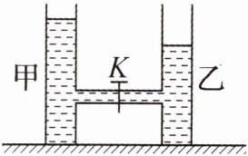 11. (2025·江苏常州期末·2分)如图,水平桌面上的甲、乙两个相同的容器用一带开关$ K $的细管相连,先把$ K $关上,在两容器中装入不同质量的水.打开开关$ K $后,水从