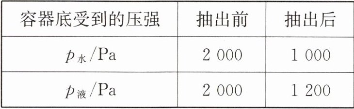 答案:8. $4$ $0.8 × 10^{3}$ 解析:由表格数据可知,抽出水和某种液体前它们对容器底部的压强相等,且相同容器的底面积相等,由$p = \frac{F}{S}$可知,原来水和某种液体对容器底部的压力相等,由$F = G = mg$可知,液体和水的质量相等,即$m_{液} = m_{水} = 4kg$;由表格数据可知,抽出前后水对容器底部的压强分别为$p_{水} = 2000Pa$,$p_{水}' = 1000Pa$,由$p = \rho_{液}gh$可得,抽出前后容器内水的深度分别为$h_{水} = \frac{p_{水}}{\rho_{水}g} = \frac{2000Pa}{1.0 × 10^{3}kg/m^{3} × 10N/kg} = 0.2m$,$h_{水}' = \frac{p_{水}'}{\rho_{水}g} = \frac{1000Pa}{1.0 × 10^{3}kg/m^{3} × 10N/kg} = 0.1m$,则抽取水的深度$\Delta h = h_{水} - h_{水}' = 0.2m - 0.1m = 0.1m$,因两个薄壁圆柱形容器的底面积相同,且两容器中抽取水和液体的体积相同,所以,容器内液体深度的变化量和水深度的变化量相等,由表格数据可知,抽出前后液体对容器底部的压强分别为$p_{液} = 2000Pa$,$p_{液}' = 1200Pa$,则抽出前后液体对容器底部的压强变化量$\Delta p_{液} = p_{液} - p_{液}' = 2000Pa - 1200Pa = 800Pa$,由$\Delta p = \rho_{液}g\Delta h$可得,液体的密度$\rho_{液} = \frac{\Delta p_{液}}{g\Delta h} = \frac{800Pa}{10N/kg × 0.1m} = 0.8 × 10^{3}kg/m^{3}$.