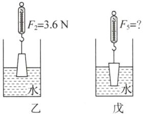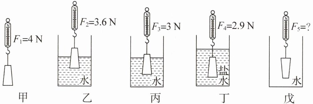 (4) 如图戊,为了探究浮力大小与深度的关系,小明把梯形窄端朝下浸入水中,当水位到达某一位置时记录弹簧测力计的示数F₅.
