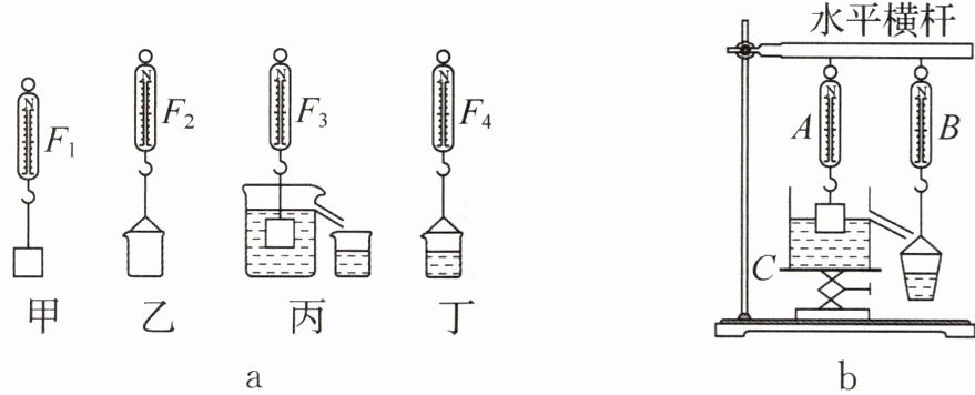 (4) 小红提出了一个新方案,她将装满水的溢水杯放在升降台的电子秤C上,用升降台来调节溢水杯的高度,如图b.当小红逐渐调高升降台时,发现随着物体浸入水中的体积越来越大,弹簧测力计A示数的变化量