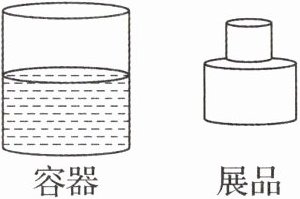 解析:(1)展品上部分的体积$V_{上}=S_{上}h_{上}=20cm^{2}×10cm = 200cm^{3}$,下部分的体积$V_{下}=S_{下}h_{下}=50cm^{2}×10cm = 500cm^{3}$,则展品的体积$V = V_{上}+V_{下}=200cm^{3}+500cm^{3}=700cm^{3}$,展品的密度$\rho=\frac{m}{V}=\frac{560g}{700cm^{3}}=0.8g/cm^{3}$。(2)容器内水的体积$V_{水}=\frac{m_{水}}{\rho_{水}}=\frac{300g}{1.0g/cm^{3}}=300cm^{3}$,则容器的底面积$S=\frac{V_{水}}{h_{水}}=\frac{300cm^{3}}{3cm}=100cm^{2}$,假设展品粗的一端向下竖直缓慢放入容器静止时漂浮,则此时受到的浮力$F_{浮}=G = mg = 0.56kg×10N/kg = 5.6N$,则排开水的体积$V_{排}=\frac{F_{浮}}{\rho_{水}g}=\frac{5.6N}{1.0×10^{3}kg/m^{3}×10N/kg}=5.6×10^{-4}m^{3}=560cm^{3}$,则展品上部分浸入水中的深度$h_{上浸}=\frac{V_{排}-V_{下}}{S_{上}}=\frac{560cm^{3}-500cm^{3}}{20cm^{2}}=3cm$,则容器内至少需要水的体积$V'_{水}=(S - S_{下})h_{下}+(S - S_{上})h_{上浸}=(100cm^{2}-50cm^{2})×10cm+(100cm^{2}-20cm^{2})×30cm = 740cm^{3}>V_{水}=300cm^{3}$,故假设不成立,展品放入水中应沉底,浸入水中的深度$h_{浸}=\frac{V_{水}}{S - S_{下}}=\frac{300cm^{3}}{100cm^{2}-50cm^{2}}=6cm<10cm$,说明展品下部分部分浸入水中,此时排开水的体积$V'_{排}=S_{下}h_{浸}=50cm^{2}×6cm = 300cm^{3}$,则展品静止时受到水的浮力$F_{浮}=\rho_{水}V'_{排}g = 1.0×10^{3}kg/m^{3}×300×10^{-6}m^{3}×10N/kg = 3N$。(3)向容器中注入$0.7kg$水,即注入水的体积$V_{注}=\frac{m_{注}}{\rho_{水}}=\frac{700g}{1.0g/cm^{3}}=700cm^{3}$,所以此时容器内水的体积$V'_{水}=V_{水}+V_{注}=300cm^{3}+700cm^{3}=1000cm^{3}$,故展品此时漂浮在水中,此时容器中水的深度$h = h_{下}+h_{上浸}+\frac{V'_{水}-V_{水}}{S}=10cm + 3cm+\frac{1000cm^{3}-740cm^{3}}{100cm^{2}}=15.6cm$,此时水对容器底部的压强$p=\rho_{水}gh = 1.0×10^{3}kg/m^{3}×10N/kg×0.156m = 1.56×10^{3}Pa$。