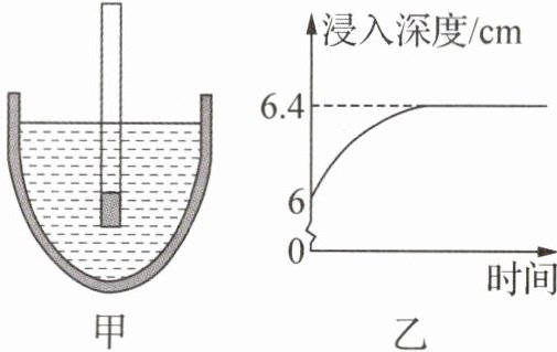 (选填“增大”“减小”或“不变”)。图乙为土密度计浸入溶液的深度随时间变化的图像,土密度计稳定后盐水的密度为