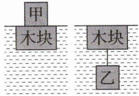 6. (2025·江苏宿迁期末·3分)如图所示,由同种材料(ρ=3×10³kg/m³)制成的合金块甲和乙,先将甲放在一长方体木块上,放入水中,木块刚好浸没;将甲拿走,用细线(体积不计)把乙系在木块下方,放入水中,木块仍浸没在水中。下列说法正确的是(ρ水=1.0g/cm³)(