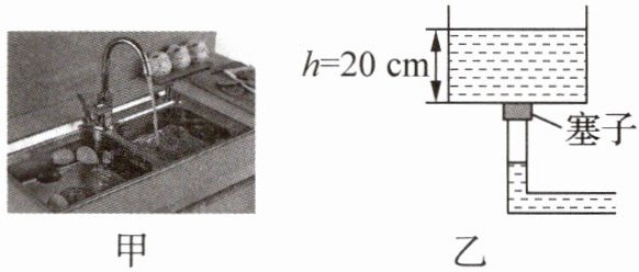 2. (2025·安徽淮北期中·6分)小溪在厨房的水槽内洗碗时(如图甲所示),发现水槽内的水越深,水槽底部的塞子越难拔起.水池近似于长方体盛水器皿,在池底有一横截面积为50 cm²的塞子(如图乙所示),此时蓄水深度约为20 cm.请用所学的知识回答以下问题.($g$取10 N/kg,$\rho_{水}$=1.0×10³ kg/m³)