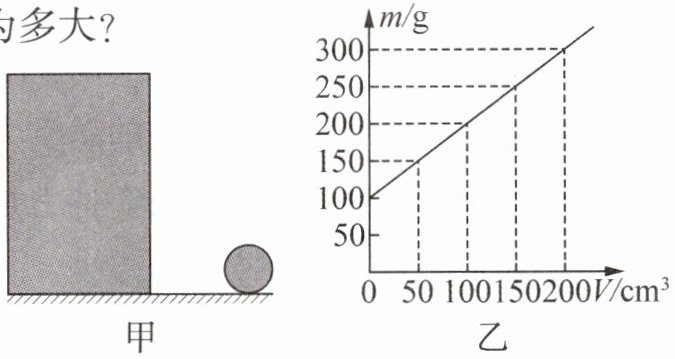 (1)由图乙可知,当液体体积$V_{\mathrm{液}}=0$时,总质量$m_{\mathrm{总}}=100\ \mathrm{g}$,则容器质量$m_{\mathrm{容器}}=100\ \mathrm{g}$。当$V_{\mathrm{液}}=200\ \mathrm{cm}^3$时,$m_{\mathrm{总}}=300\ \mathrm{g}$,液体质量$m_{\mathrm{液}}=300\ \mathrm{g}-100\ \mathrm{g}=200\ \mathrm{g}$,液体密度$\rho_{\mathrm{液}}=\frac{m_{\mathrm{液}}}{V_{\mathrm{液}}}=\frac{200\ \mathrm{g}}{200\ \mathrm{cm}^3}=1\ \mathrm{g/cm}^3$。