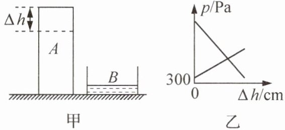 答案:10.2 8解析:圆柱体A剩余部分对桌面的压强随$\Delta h$的增大而减小,则斜向下的直线为圆柱体A剩余部分对桌面的压强与$\Delta h$的关系图线,斜向上的直线为容器B对桌面的压强与$\Delta h$的关系图线。由图乙可知,当$\Delta h = 0 \mathrm { c m }$时,容器B对桌面的压强为$3 0 0 \mathrm { P a }$,则容器B对桌面的压力$F = p S _ { 容 } = 3 0 0 \mathrm { P a } × 1 5 0 × 1 0 ^ { - 4 } \mathrm { m } ^ { 2 } = 4 . 5 \mathrm { N }$,容器B中水的重力$G _ { 水 } = F - G _ { 容 } = 4 . 5 \mathrm { N } - 1 . 5 \mathrm { N } = 3 \mathrm { N }$,水的质量$m _ { 水 } = \frac { G _ { 水 } } { g } = \frac { 3 \mathrm { N } } { 1 0 \mathrm { N } / \mathrm { k g } } = 0 . 3 \mathrm { k g } = 3 0 0 \mathrm { g }$,水的体积$V _ { 水 } = \frac { m _ { 水 } } { \rho _ { 水 } } = \frac { 3 0 0 \mathrm { g } } { 1 . 0 \mathrm { g } / \mathrm { c m } ^ { 3 } } = 3 0 0 \mathrm { c m } ^ { 3 }$,则一开始水的深度$h _ { 水 } = \frac { V _ { 水 } } { S _ { 容 } } = \frac { 3 0 0 \mathrm { c m } ^ { 3 } } { 1 5 0 \mathrm { c m } ^ { 2 } } = 2 \mathrm { c m }$。若水没有溢出,则圆柱体A剩余部分对地面的压强$p _ { A } = \rho _ { A } g ( 0 . 1 4 \mathrm { m } - \Delta h )$ ①,此时容器B对地面的压强$p _ { B } = \frac { F + G _ { A \mathrm{ 切 }} } { S _ { 容 } } = \frac { 4 . 5 \mathrm { N } + \rho _ { A } S _ { A } \Delta h g } { S _ { 容 } }$ ②,由题意知$p _ { A } : p _ { B } = 9 : 1 0$ ③,联立①②③并代入数据,可得$\Delta h \approx 0 . 0 7 9 \mathrm { m } = 7 . 9 \mathrm { c m } > h _ { 容 } = 5 \mathrm { c m }$,此时容器B中能够装水的总体积$V _ { B \mathrm{ 剩 }} = ( S _ { 容 } - S _ { A } ) h _ { 容 } = ( 1 5 0 \mathrm { c m } ^ { 2 } - 1 0 0 \mathrm { c m } ^ { 2 } ) × 5 \mathrm { c m } = 2 5 0 \mathrm { c m } ^ { 3 } < V _ { 水 }$,所以水会溢出,容器B中剩余水的质量$m _ { B \mathrm{ 剩 }} = \rho _ { 水 } V _ { B \mathrm{ 剩 }} = 1 . 0 \mathrm { g } / \mathrm { c m } ^ { 3 } × 2 5 0 \mathrm { c m } ^ { 3 } = 2 5 0 \mathrm { g } = 0 . 2 5 \mathrm { k g }$,容器B中剩余水的重力$G _ { B \mathrm{ 剩 }} = m _ { B \mathrm{ 剩 }} g = 0 . 2 5 \mathrm { k g } × 1 0 \mathrm { N } / \mathrm { k g } = 2 . 5 \mathrm { N }$,则容器B对地面的压强$p _ { B } = \frac { G _ { 容 } + G _ { B \mathrm{ 剩 }} + G _ { A \mathrm{ 切 }} } { S _ { 容 } } = \frac { 1 . 5 \mathrm { N } + 2 . 5 \mathrm { N } + \rho _ { A } S _ { A } \Delta h g } { S _ { 容 } }$ ④,联立①③④并代入数据,解得$\Delta h = 0 . 0 8 \mathrm { m } = 8 \mathrm { c m }$,即此时切去高度$\Delta h$为$8 \mathrm { c m }$。
