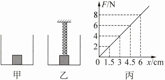 (4)若注水前,将物块用轻质弹簧悬挂,使物块与容器之间恰好无弹力,如图乙所示。已知该弹簧弹力大小F与其伸长量(或压缩量)x之间的关系如图丙所示,向容器中慢慢注入水,直到水面与物块上表面平齐,求水面与物块上表面平齐时水的深度$ h_3 $。