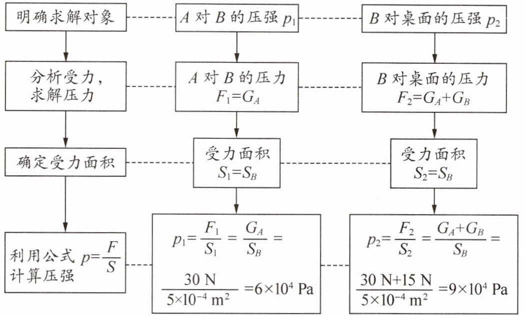典例3 如图所示,物体 $ A $、$ B $ 叠放在水平桌面上,$ A $、$ B $ 均为正方体,物体 $ A $ 重 $ 30 \, \mathrm{N} $,物体 $ B $ 重 $ 15 \, \mathrm{N} $,物体 $ A $ 的底面积为 $ 10 \, \mathrm{cm}^2 $,物体 $ B $ 的底面积为 $ 5 \, \mathrm{cm}^2 $。则 $ A $ 对 $ B $ 的压强是