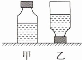 倒立时(乙图):瓶子下部为锥体,部分水压在瓶壁上,水对瓶盖的压力 $ F_2 $ 小于水的重力 $ G_{\mathrm{水}} $($ F_2 < G_{\mathrm{水}} $)。