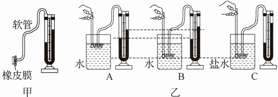 (2) 在使用压强计前,发现U形管左、右两侧的水面不在同一水平面,如图甲所示,为了使U形管左、右两侧的水面相平,正确的调节方法是