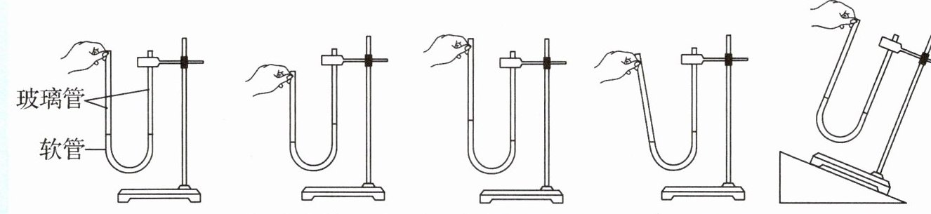 【思路分析】连通器中,当液体不流动时,连通器各部分中的液面总是相平的,因此不论是玻璃管下降、上升、还是倾斜,以及放置在斜面上,水面静止后,两根玻璃管中水面都在同一高度。