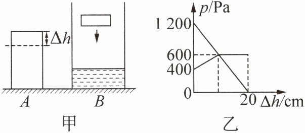 由图乙知,当$\Delta h=0\ \mathrm{cm}$时,A对地面压强$p_A=1200\ \mathrm{Pa}$;当$\Delta h=20\ \mathrm{cm}$时,压强为$0\ \mathrm{Pa}$,故A的高度$h_A=20\ \mathrm{cm}=0.2\ \mathrm{m}$。
