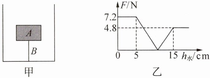 即A受到重力和杆对其的支持力的作用,二力平衡,则有G = F₁ = 7.2N,长方体A的质量mA = G / g = 7.2N / 10N/kg = 0.72kg。(2)当水深大于5cm时,A受到竖直向上的浮力作用,刚开始时,A排开水的体积小,受到的浮力小,A受到杆对其向上的支持力作用,受力分析如下: