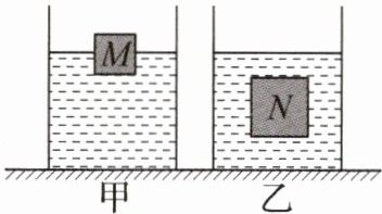 【思路分析】容器对水平面的压力等于容器、液体、杯子和木块的重力之和,甲、乙中容器、杯子和木块重力相同,水和盐水的体积相同,盐水的密度大,根据$\rho=\frac{m}{V}$可知,乙中盐水的质量更大,因此盐水的重力更大,两容器的底面积相同,根据$p=\frac{F}{S}$可知,乙对水平面的压强更大. 由图可知,木块在甲容器中放在杯子中,受到杯子的支持力,大小等于木块的重力,木块没有排开液体,即受到的浮力为$0$,木块在乙中排开了液体,受到了浮力,则木块在甲容器中受到的浮力小于在乙容器中受到的浮力. 甲中杯子和木块整体漂浮在水中,整体受到的浮力等于整体的重力;乙中杯子和木块整体悬浮在水中,整体受到的浮力等于整体的重力,因此,甲、乙中整体受到的浮力相等,乙中盐水的密度更大,根据$F_{浮}=\rho_{液}V_{排}g$可知,甲中排开液体的体积大于乙中排开液体的体积,根据$V_{排}=S_{容}h$可知,甲容器中液面上升的高度大于乙容器中液面上升的高度. 将乙容器中的杯子轻轻向下推动少许,杯子和木块整体排开液体的体积不会改变,因此整体受到的浮力不变,仍等于整体的重力,故仍悬浮在液体中,不会沉底.