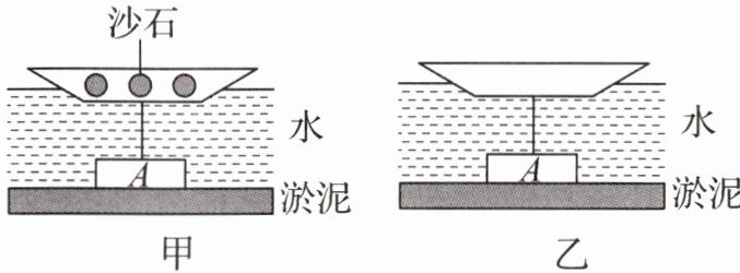 【变式 3】(2025·山东威海一模)小红受“怀丙打捞铁牛”故事启发,决定模拟“打捞”过程,图甲中长方体重物$A$陷入淤泥内(下表面与淤泥紧密贴合),质量为$200g$的小船装有$5N$沙石后,用细绳将小船和重物$A$连接,此时细绳刚好伸直,重物$A$上表面距离水面$20cm$. $A$重力为$6N$、底面积为$30cm^{2}$、高为$4cm$. 卸下沙石的过程中,可借助小船的浮力将重物拉起,细绳的质量和体积忽略不计,$g$取$10N/kg$,$\rho_{水}=1.0×10^{3}kg/m^{3}$. 求: