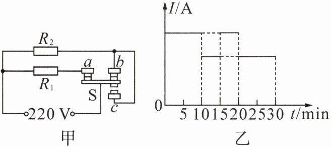 12. 小尚观察家里的电饭锅,其简化电路如图甲所示.$R_{1}$和$R_{2}$均为电热丝,$R_{1}:R_{2}=2:1$,开关是自动控制开关,开关向上与触点a、b接通,向下仅与触点c接通. 如图乙所示为这个电饭锅在某次正常煮饭全过程中总电流随时间的变化图像,且10~15 min的过程中$R_{2}$消耗的电能为$1.32×10^{5}$J. 求:
