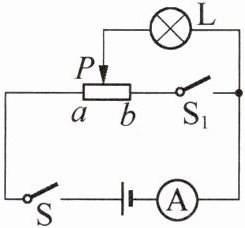 答案:11. 6 1.5 解析:当开关S、$S_1$均闭合,滑片P移至a端时,灯泡和滑动变阻器并联,电流表测干路电流,因为灯泡正常发光,所以电源电压$U = U_{L}=6V$,由$P = UI$可得,通过灯泡的电流$I_{L}=\frac{P_{L}}{U_{L}}=\frac{6W}{6V}=1A$,则通过滑动变阻器的电流$I_{滑}=I - I_{L}=2A - 1A = 1A$,由欧姆定律可得,滑动变阻器的最大阻值$R_{滑}=\frac{U}{I_{滑}}=\frac{6V}{1A}=6\Omega$。灯泡的电阻$R_{L}=\frac{U_{L}}{I_{L}}=\frac{6V}{1A}=6\Omega$。当开关S闭合、$S_1$断开,滑片P移至b端时,灯泡与滑动变阻器的最大阻值串联,此时电路的总电阻$R_{总}=R_{滑}+R_{L}=6\Omega + 6\Omega = 12\Omega$,电路中的电流$I'=\frac{U}{R_{总}}=\frac{6V}{12\Omega}=0.5A$,则灯泡L的实际功率$P_{实}=I'^{2}R_{L}=(0.5A)^{2}×6\Omega = 1.5W$。