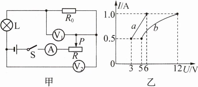 答案:9. D 解析:由图甲可知,小灯泡L、定值电阻$R_0$与滑动变阻器R串联,电压表$V_1$测$R_0$两端的电压,电压表$V_2$测L与$R_0$两端的总电压,电流表测电路中的电流,故A错误;电压表$V_2$的示数大于电压表$V_1$的示数,所以图乙中a直线表示电流表示数与电压表$V_1$示数的关系,则b曲线表示电流表示数与电压表$V_2$示数的关系,故B错误;当滑片位于最左端时,滑动变阻器接入电路的阻值为零,此时L和$R_0$串联,电路中电流最大,由图乙可知,最大电流$I_{max}=1.0A$,此时$V_1$的示数即$U_0 = 6V$,$V_2$的示数即电源电压$U = 12V$,则小灯泡两端的电压$U_L = U - U_0 = 12V - 6V = 6V$,小灯泡恰好正常发光,则小灯泡的额定功率$P_L = U_LI_{max}=6V×1.0A = 6W$,故C错误;当滑片位于最右端时,L、$R_0$、R串联,此时电路的总电阻最大,电路中电流最小,由图乙可知,最小电流$I_{min}=0.5A$,$V_1$的示数$U_0' = 3V$,$V_2$的示数$U_{V2}=5V$,此时L两端的电压$U_L' = U_{V2}-U_0' = 5V - 3V = 2V$,则小灯泡的实际功率$P_L' = U_L'I_{min}=2V×0.5A = 1W$,故D正确。