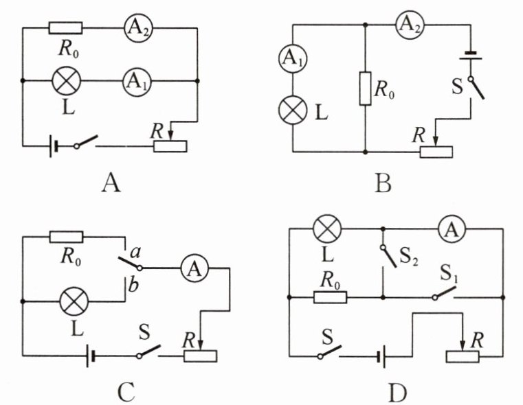 答案:6.C 解析:图A中,$R_{0}$与L并联后与R串联,电流表$A_{1}$测量通过L的电流$I_{1}$,电流表$A_{2}$测量通过$R_{0}$的电流$I_{2}$,移动滑动变阻器滑片,使电流表$A_{1}$的示数$I_{1}$等于小灯泡的额定电流,由欧姆定律及并联电路的电压规律可知,小灯泡的额定电压为$(I_{2}-I_{1})R_{0}$,可求得小灯泡的额定功率为$I_{1}(I_{2}-I_{1})R_{0}$,故A不符合题意;
