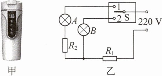 4. (2025·北京模拟)如图甲所示为一自动加热水杯,其工作原理简化电路如图乙. S 为一温控开关,A、B 为颜色不同的指示灯,其电阻忽略不计,红灯亮表示加热,绿灯亮表示保温. $ R_{1} $、$ R_{2} $ 为加热电阻,其中 $ R_{1} $ 阻值为 200 Ω,当加热到预定温度后,S 自动切换到另一位置,处于保温状态时的电功率为 44 W,不考虑温度对电阻的影响.