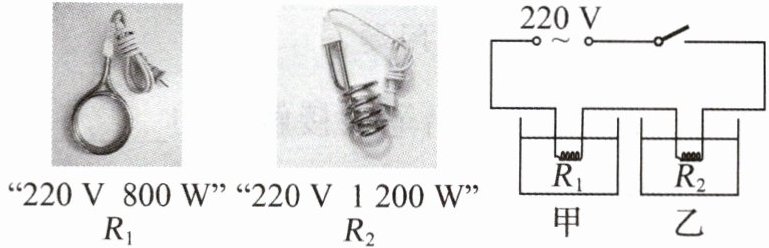 7. 小李在网上买了两个纯电阻“热得快”$ R_1 $、$ R_2 $,规格参数如图. 他将两个“热得快”的导线插头拆开,改装串联起来,接到家庭电路中,并把 $ R_1 $、$ R_2 $ 分别放入相同的甲、乙容器中,两容器