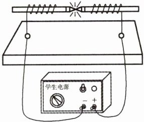 4. 学习电学知识后,小芳把裸铜线分别在两个削尖的铅笔芯上绕几圈,使笔尖刚好接触,如图所示,接上 $ 9\ \mathrm{V} $ 的电源,接触点出现了明亮的