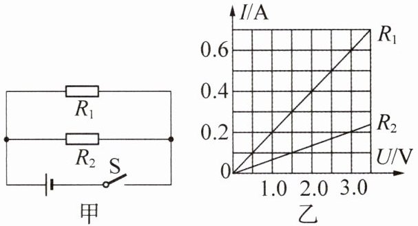 2. 两个定值电阻 $ R_1 $、$ R_2 $ 并联在电路中,如图甲所示,通过它们的电流与其两端电压的关系如图乙所示. 闭合开关 $ S $, 经过相同的时间,$ R_1 $、$ R_2 $ 产生的热量之比为(