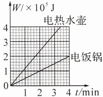 1. 额定电压相同的电热水壶、电饭锅正常工作过程中消耗的电能 $ W $ 和通电时间 $ t $ 的关系如图所示. 两个用电器正常工作时,下列判断正确的是(