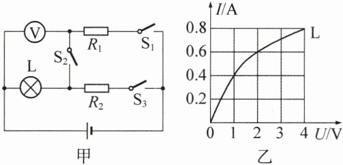 解:当只闭合$S_1$、$S_2$时,$R_1$与$L$串联,电压表测$L$两端电压。由图乙知,$U_L=2\,\mathrm{V}$时,$I_L=0.6\,\mathrm{A}$。
