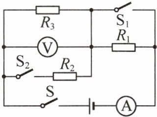 (2)当闭合开关$S$,断开$S_{1}$和$S_{2}$时,$R_{1}$与$R_{3}$串联,电压表测$R_{3}$两端电压$U_{3}' = 3\,\mathrm{V}$。