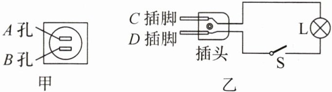 (选填“$C$”或“$D$”)插脚插入 $A$ 孔。丙图是两种墙壁开关,其按钮可绕面板内转动,根据你的生活经验,