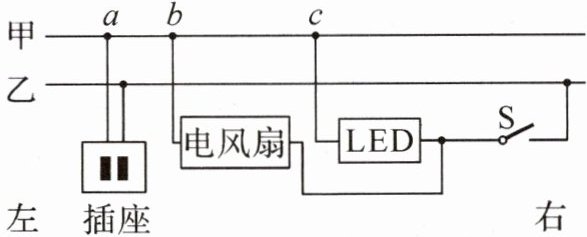 解:闭合开关$S$,初始状态LED灯发光、电风扇正常工作,插座右孔氖管发光,左孔不发光,说明此时电路正常,甲为火线,乙为零线。