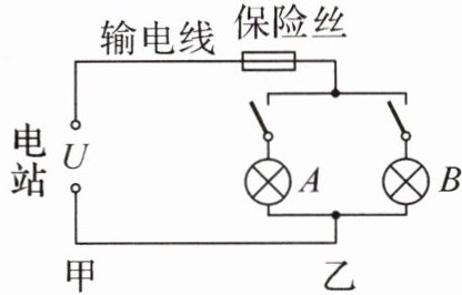 11. 如图所示,甲地的电站以恒定电压 $U$ 给乙地的 $A$、$B$ 两盏灯供电,输电线路的电阻不能忽略。下列说法正确的是(