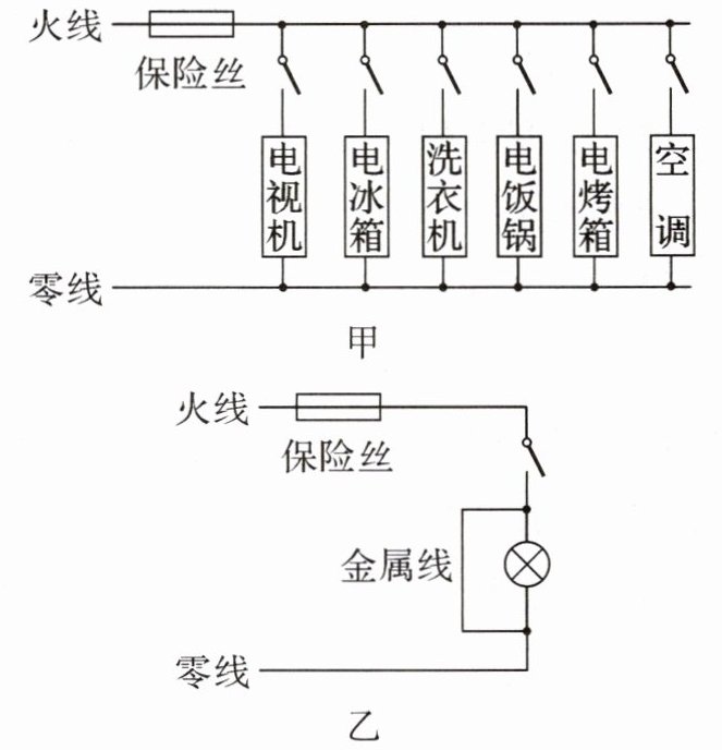 7. (2025·河南焦作二模)如图所示的家庭电路中,开关闭合后,保险丝因电流过大而熔断。甲、乙两图产生电流过大的原因是不同的,甲图中的原因是