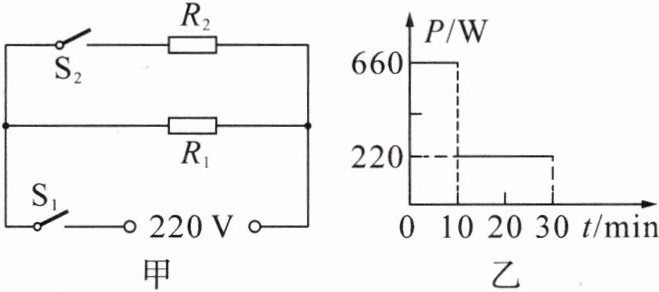 8. 如图所示,在科技小发明活动中,小冰设计了一种电热饮水机电路,如图甲所示,R₁和 R₂均为电热丝,S₂是自动控制开关,可实现“加热”“保温”不同挡位之间的切换,饮水机工作时功率随时间变化的关系图像如图乙所示. 求: