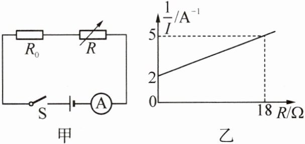 9. 如图甲所示电路,电源电压不变,R₀为定值电阻,R 为电阻箱. 调节电阻箱 R 的阻值,电流表示数的倒数 $\frac{1}{I}$ 与电阻箱阻值 R 的关系图像如图乙所示. 以下说法正确的是 (