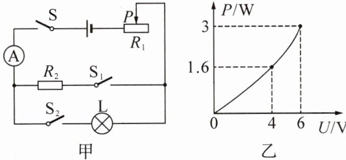答案:7. $0.3\ 12\ 20$ 解析:当闭合$S$和$S_1$、断开$S_2$时,$R_1$与$R_2$串联,电流表测电路中电流,滑片$P$在中点时,$R_2$的功率为$0.9\ \mathrm{W}$,由$P=I^2R$可得,此时电流表示数即电路中的电流$I=\sqrt{\frac{P_2}{R_2}}=\sqrt{\frac{0.9\ \mathrm{W}}{10\ \Omega}}=0.3\ \mathrm{A}$,由$I=\frac{U}{R}$可得,电源电压$U=I(R_2+\frac{1}{2}R_1)=0.3\ \mathrm{A}×(10\ \Omega+\frac{1}{2}×60\ \Omega)=12\ \mathrm{V}$.当闭合$S$和$S_2$、断开$S_1$时,$R_1$与$L$串联,由图乙可知,当$L$的功率为$1.6\ \mathrm{W}$时,$L$两端的电压为$4\ \mathrm{V}$,由$P=UI$可得,此时电路中的电流$I'=\frac{P_1}{U_L}=\frac{1.6\ \mathrm{W}}{4\ \mathrm{V}}=0.4\ \mathrm{A}$,$R_1$两端的电压$U_1=U-U_L=12\ \mathrm{V}-4\ \mathrm{V}=8\ \mathrm{V}$,则滑动变阻器接入电路的阻值$R_1'=\frac{U_1}{I'}=\frac{8\ \mathrm{V}}{0.4\ \mathrm{A}}=20\ \Omega$.
