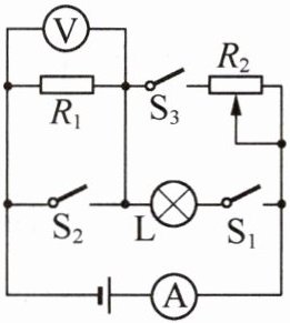解析:(1)闭合所有开关,$R_1$被短路,此时L与$R_2$并联,小灯泡正常发光,所以电源电压等于小灯泡L的额定电压,即$U = U_{L额} = 6\ V$,通过滑动变阻器的电流$I_{滑} = \frac{P_{滑}}{U} = \frac{3.6\ W}{6\ V} = 0.6\ A$,则滑动变阻器的最大电阻$R_{滑} = \frac{U}{I_{滑}} = \frac{6\ V}{0.6\ A} = 10\ \Omega$.(2)当只闭合开关$S_1$时,L与$R_1$串联,小灯泡的电阻$R_{L} = \frac{U_{L额}^2}{P_{L额}} = \frac{(6\ V)^2}{3.6\ W} = 10\ \Omega$,总电阻$R = R_1 + R_{L} = 2\ \Omega + 10\ \Omega = 12\ \Omega$,此时电路中的电流$I = \frac{U}{R} = \frac{6\ V}{12\ \Omega} = 0.5\ A$,则小灯泡的实际功率$P_{L实} = I^2R_{L} = (0.5\ A)^2 × 10\ \Omega = 2.5\ W$.(3)当只闭合开关$S_3$时,$R_1$与$R_2$串联,若电流表的示数为它的最大量程$I_{max} = 0.6\ A$,此时$R_1$两端的电压$U_1 = I_{max}R_1 = 0.6\ A × 2\ \Omega = 1.2\ V$,没有超过电压表的量程,各元件均安全,此时电路的总功率最大为$P_{max} = UI_{max} = 6\ V × 0.6\ A = 3.6\ W$;当滑动变阻器接入电路的阻值最大时,电路中的电流最小为$I_{min} = \frac{U}{R_1 + R_{滑}} = \frac{6\ V}{2\ \Omega + 10\ \Omega} = 0.5\ A$,此时电路的最小总功率$P_{min} = UI_{min} = 6\ V × 0.5\ A = 3\ W$,所以电路允许的总功率的变化范围为$3~3.6\ W$.