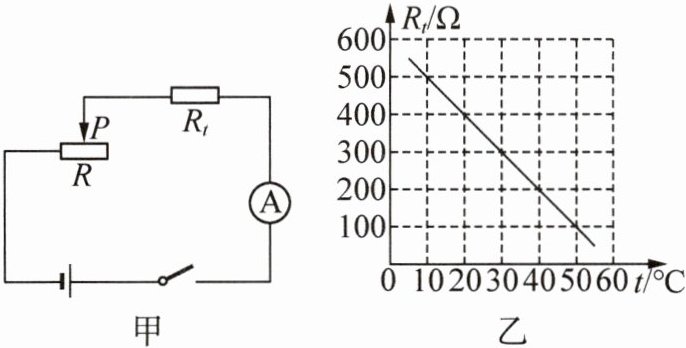 5. (2025·河北石家庄模拟)图甲所示是利用热敏电阻测量温度的电路,图乙所示是热敏电阻 $ R_t $ 的阻值随温度变化的关系图像。电路中电源电压保持 U 不变,热敏电阻的测温量程为 0~60 ℃。闭合开关,在 50 ℃时,热敏电阻 $ R_t $ 的阻值与滑动变阻器滑片恰好在中点时的电阻相等,且此时灵敏电流表示数为 0.03 A。下列分析正确的是(