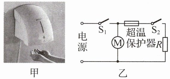 6. (2025·江苏泰州期末)图甲是宾馆常见的一种感应干手器,将手放在干手器的风口下,干手器会自动送出温度适宜的风,当手离开出风口时,感应开关会自动停风关机。图乙是该干手器的简化电路图,其中$R$是加热电阻丝,$M$是吹风的电动机,$S_1$是感应开关,$S_2$是温控开关,会根据环境温度自动断开或闭合来控制加热电阻丝。如表是该干手器的部分参数,则: