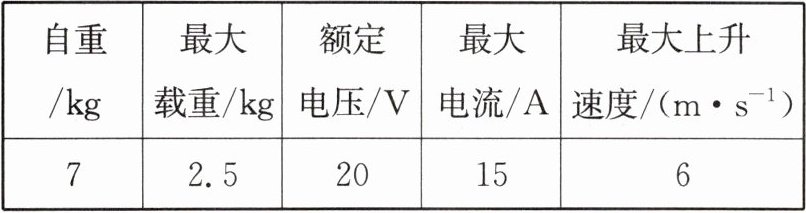 解析:(1)由表格数据可得,无人机的最大功率$P_{max} = UI_{max} = 20V×15A = 300W$。(2)电动机线圈在最大电流下的发热量$Q = I^2Rt = (12A)^2×6Ω×5×60s = 2.592×10^5 J$。(3)货物重力$G_{货} = m_{货}g = 2.5kg×10N/kg = 25N$,货物上升的高度$h = vt = 6m/s×5×60s = 1800m$,上升过程中对货物做的有用功$W_{有用} = G_{货}h = 25N×1800m = 4.5×10^4 J$,本次上升过程中无人机消耗的电能$W = UI_{max}t = 20V×15A×5×60s = 9×10^4 J$,则电能转化成货物上升机械能的效率$\eta = \frac{W_{有用}}{W}×100\% = \frac{4.5×10^4 J}{9×10^4 J}×100\% = 50\%$。