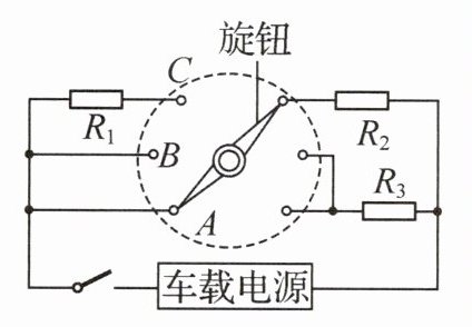 4. (2025·山东潍坊二模)某款智能汽车后视镜,具有防雾、除雨露、除冰霜三种功能,对应的功率依次增大,部分功率如表所示。如图所示是其原理图,旋钮开关可拧至$A$、$B$、$C$三个不同位置,$R_1$、$R_2$、$R_3$均为定值电阻,$R_1$阻值为$4Ω$,$R_3$阻值大于$R_2$阻值,车载电源输出电压为$12V$。某次使用除雨挡仅对玻璃加热,在$10min$内使玻璃升温$10℃$,已知后视镜玻璃的质量为$360g$,玻璃的比热容为$0.75×10^3J/(kg·℃)$,求: