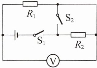 4.如图所示,电源电压保持不变,$ R_{2} = 40 \, \Omega $,闭合 $ \mathrm{S}_{1} $、断开 $ \mathrm{S}_{2} $,$ R_{1} $ 的电功率 $ P_{1} = 0.4 \, \mathrm{W} $,电压表示数为 $ U_{1} $,开关 $ \mathrm{S}_{1} $、$ \mathrm{S}_{2} $ 都闭合时电压表示数为 $ 5U_{1} $,则 $ R_{1} $ 的电阻为