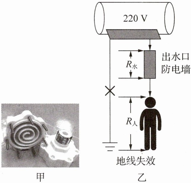 4. (2025·广东江门期末)随着科技的进步,家庭用电安全日益受到关注.防电墙技术由民族品牌企业推动,被制定为电热水器国家强制性标准.防电墙技术的规范表述是“水电阻衰减隔离法”,它利用了水本身具有电阻的特性,形成“防电”的效果.电热水器工作时,加热器内胆里的水有时也会通电,与普通水管里的水柱相比,流经防电墙内部的水沿内部隔片螺旋流动,通过尽量增加水流的长度,以达到增大电阻、减小电流的目的,防电墙的内部结构如图甲所示.