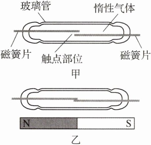7. 亮点原创 门磁传感器是智能家居常见的传感器,常用于探测门、窗是否被非法打开。门磁传感器的核心元件是干簧管,干簧管是一种磁控开关,其结构如图甲所示,其中磁簧片被固定于玻璃管内。将一个条形磁体靠近并与干簧管平行放置时,触点就会闭合,电路接通,如图乙所示;当条形磁体远离干簧管时,触点就会断开。由此可知,磁簧片应是一种有弹性、易被