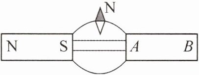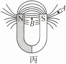 答案:11.(1)S (2)①磁化 ③磁感线 N (3)小于解析:(1)由图甲知,左侧的小磁针静止时S极都指向A端,因同名磁极相互排斥、异名磁极相互吸引,所以条形磁体的A端为N极、B端为S极.(2)①轻敲玻璃板的目的是减小摩擦力对铁屑的影响,铁屑在磁场中会被磁体磁化,相当于一个个小磁针,从而在磁场中有序地排列起来.③人们仿照铁屑在磁场中排列的情况和小磁针N极的指向,画出一些带箭头的曲线形象地描述磁场,物理学中把这样的曲线叫作磁感线,在磁体的外部,磁感线是从N极出发回到S极的.(3)由图丙可知,B处的磁感线比A处的磁感线密集一些,所以A点的磁场强度小于B点的磁场强度.