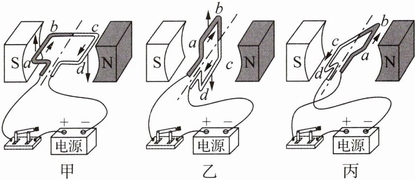 而越过平衡位置,但不能持续转动,最后要返回平衡位置. 使线圈静止在图丙的位置上,这是刚才线圈越过平衡位置以后所到达的地方,闭合开关,线圈逆时针转动. 由此我们可以分析出线圈不能连续转动的原因是